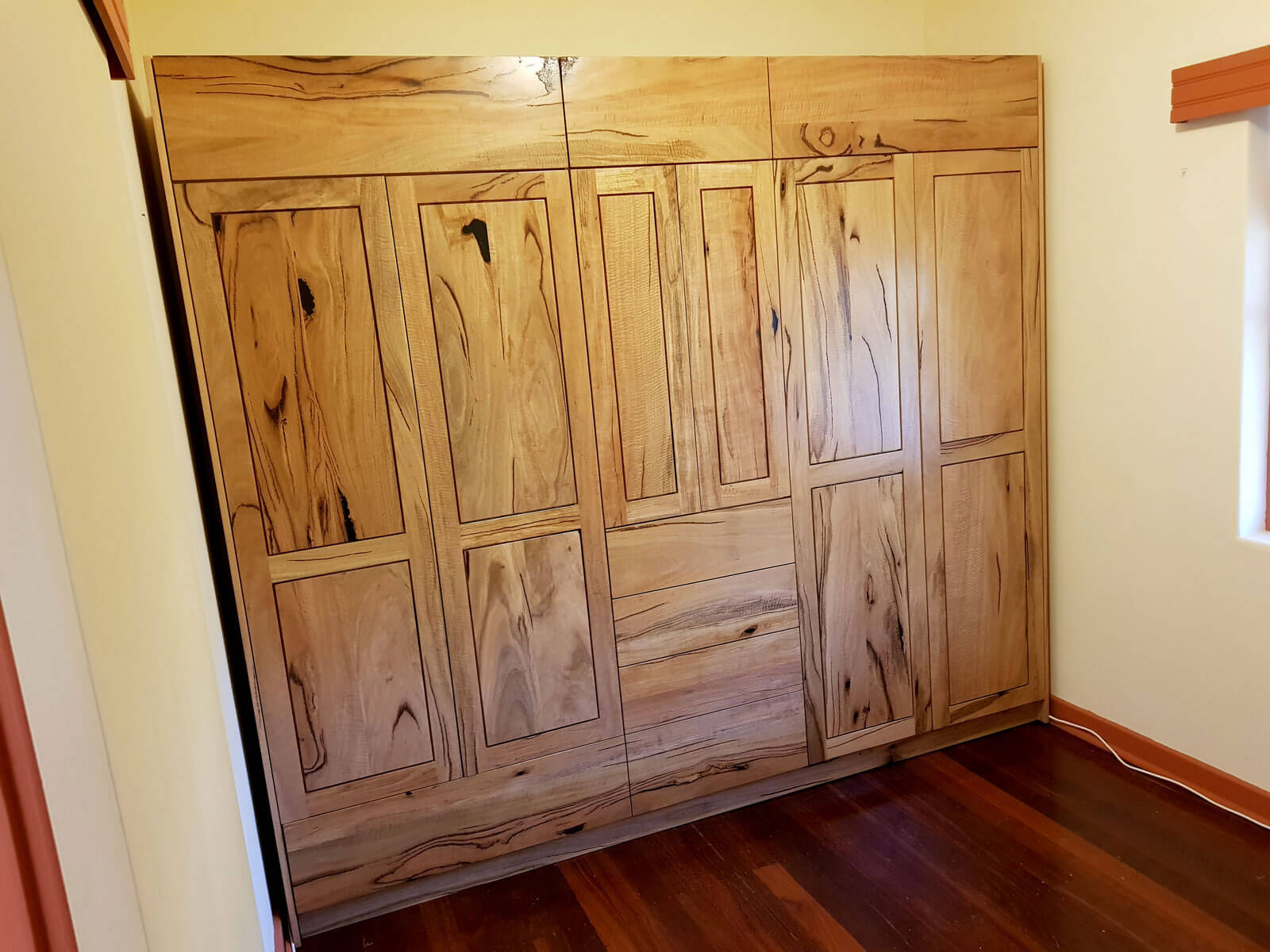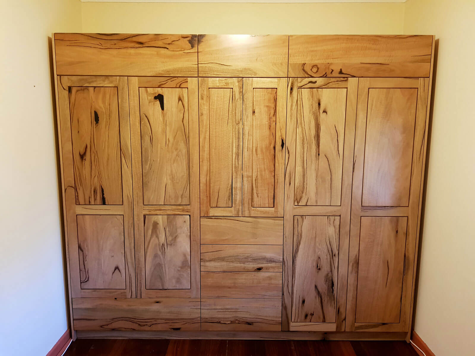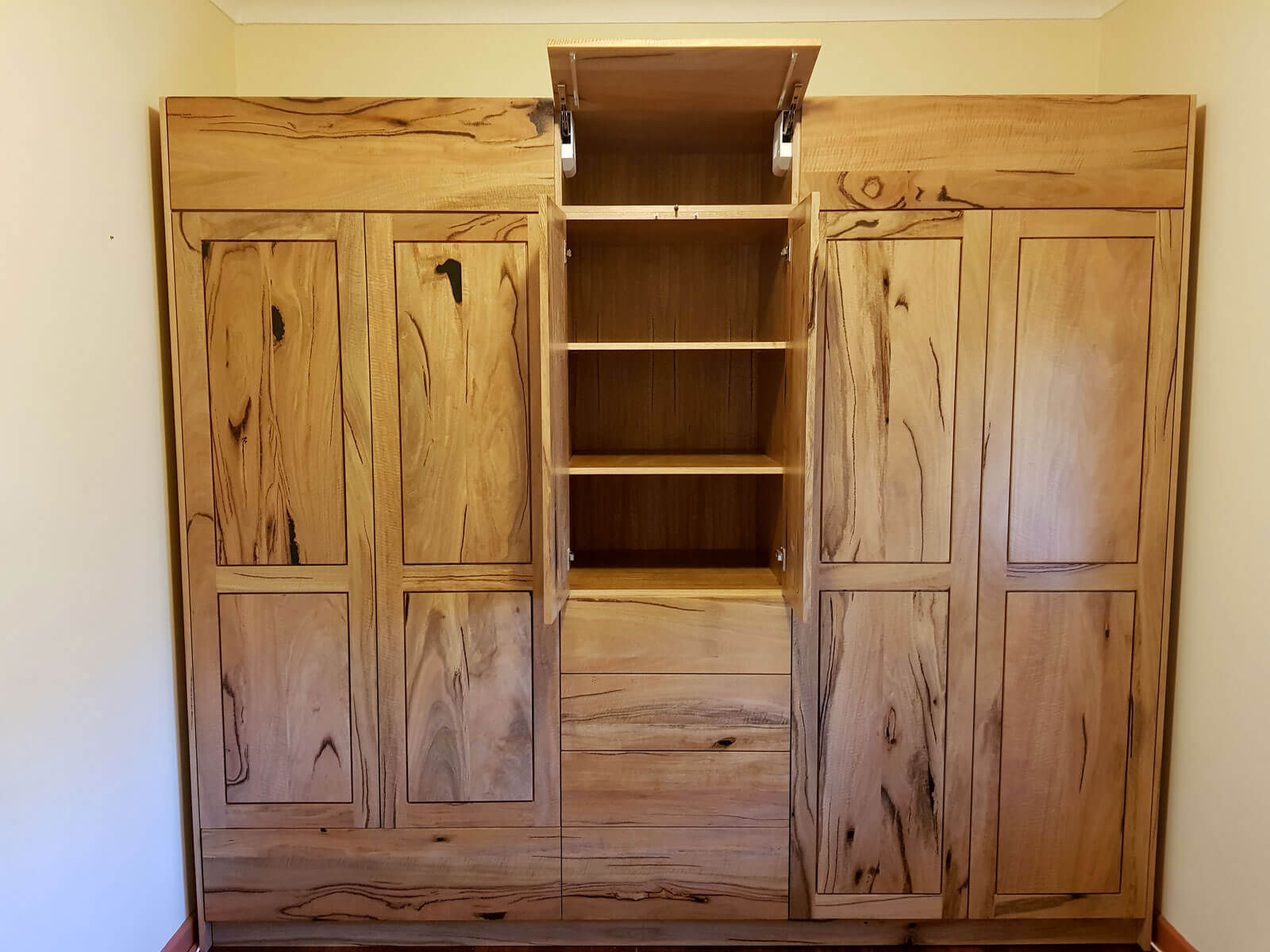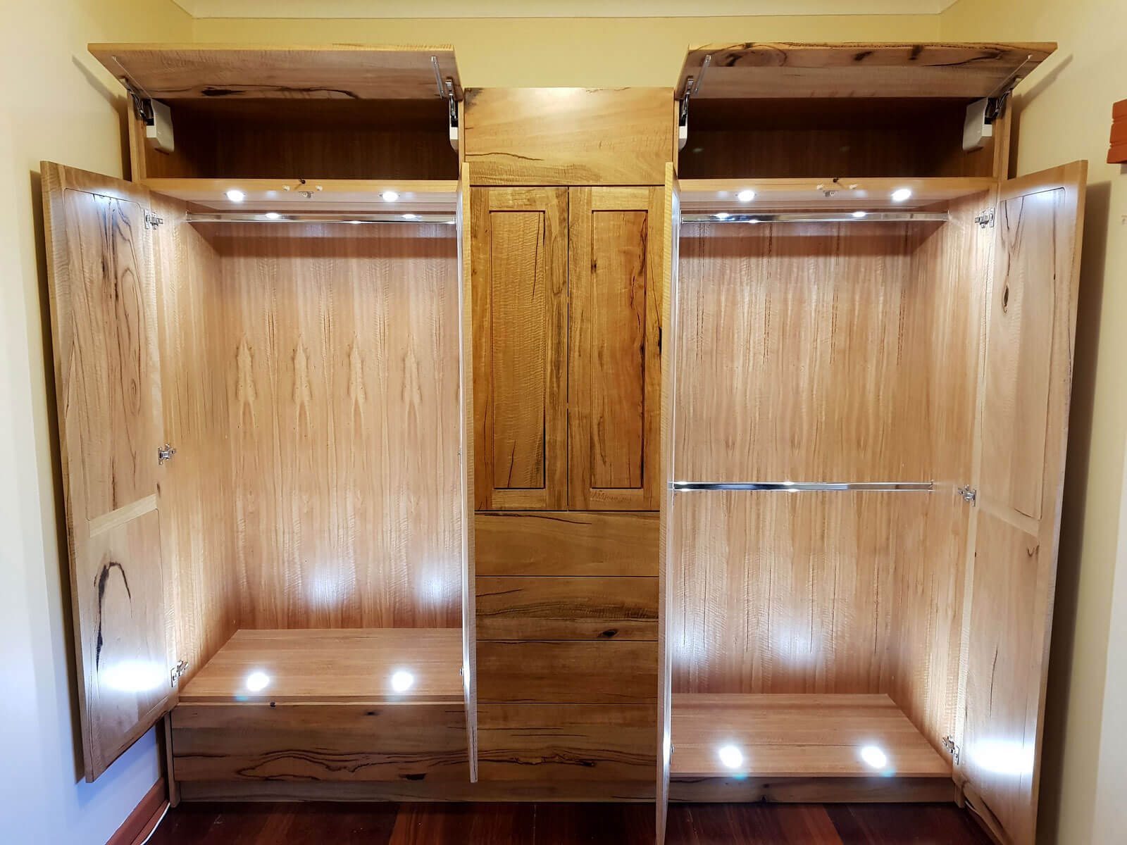 Spoil yourself with this beautiful wardrobe from Jarrimber! Shown in stunning Marri timber, this features soft close doors, drawers and flip-up plus per sensored lighting top and bottom with clean, handle-less touch to open mechanisms.