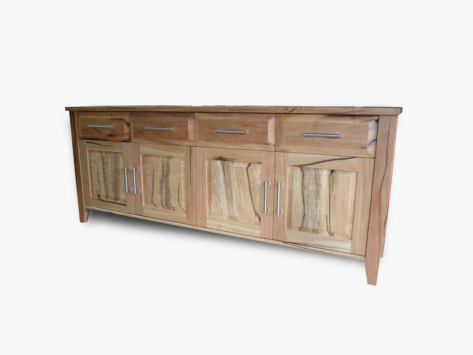 A beautifully crafted Buffet Unit featuring 4 Drawers and 4 Cupboards each with adjustable shelves inside. This buffet has distinctive lines on both doors, drawers and sides that give this unit a great look. Displayed her as a Marri Buffet, but easily crafted in Jarrah, Tasmanian Oak & Blackwood