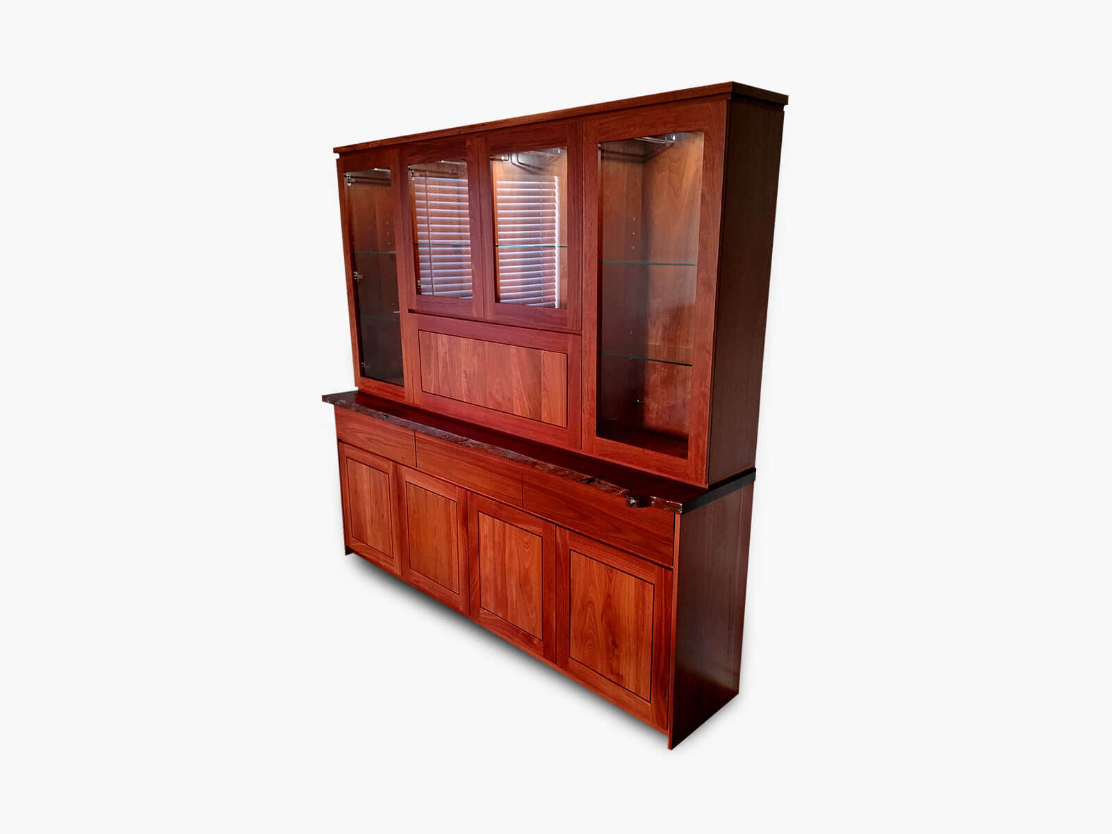 Our Gwelup display unit exhibits plenty of storage, functionality and most of look looks fantastic. With a drop down hutch for storing your licquor, a combination of drawers and doors plus glass doors up high to display your more treasured items.