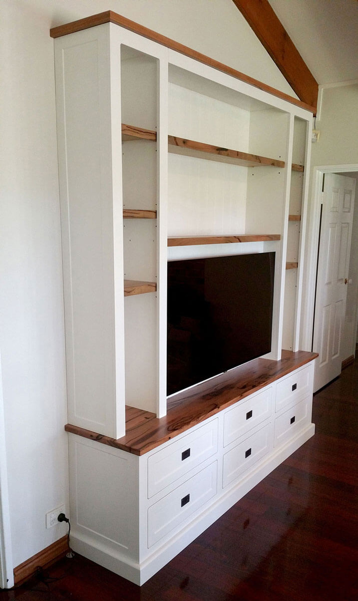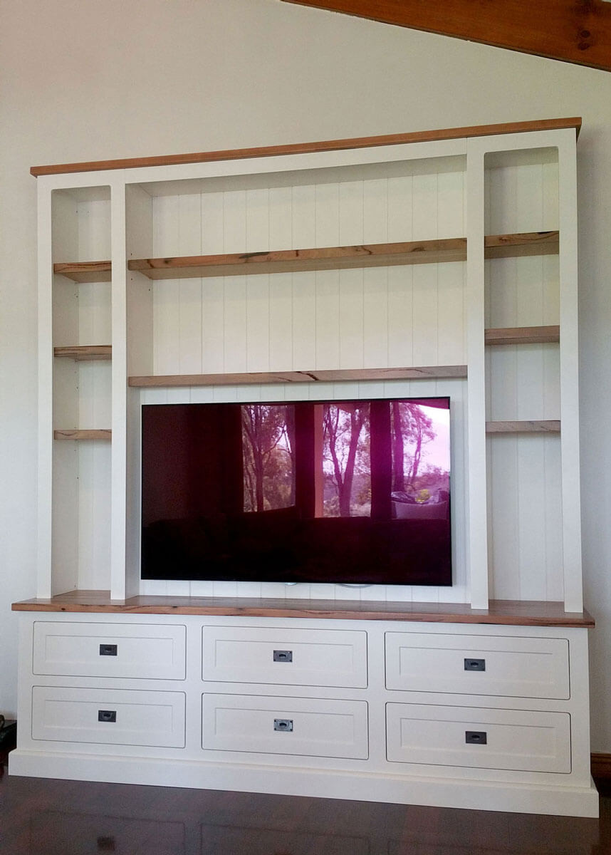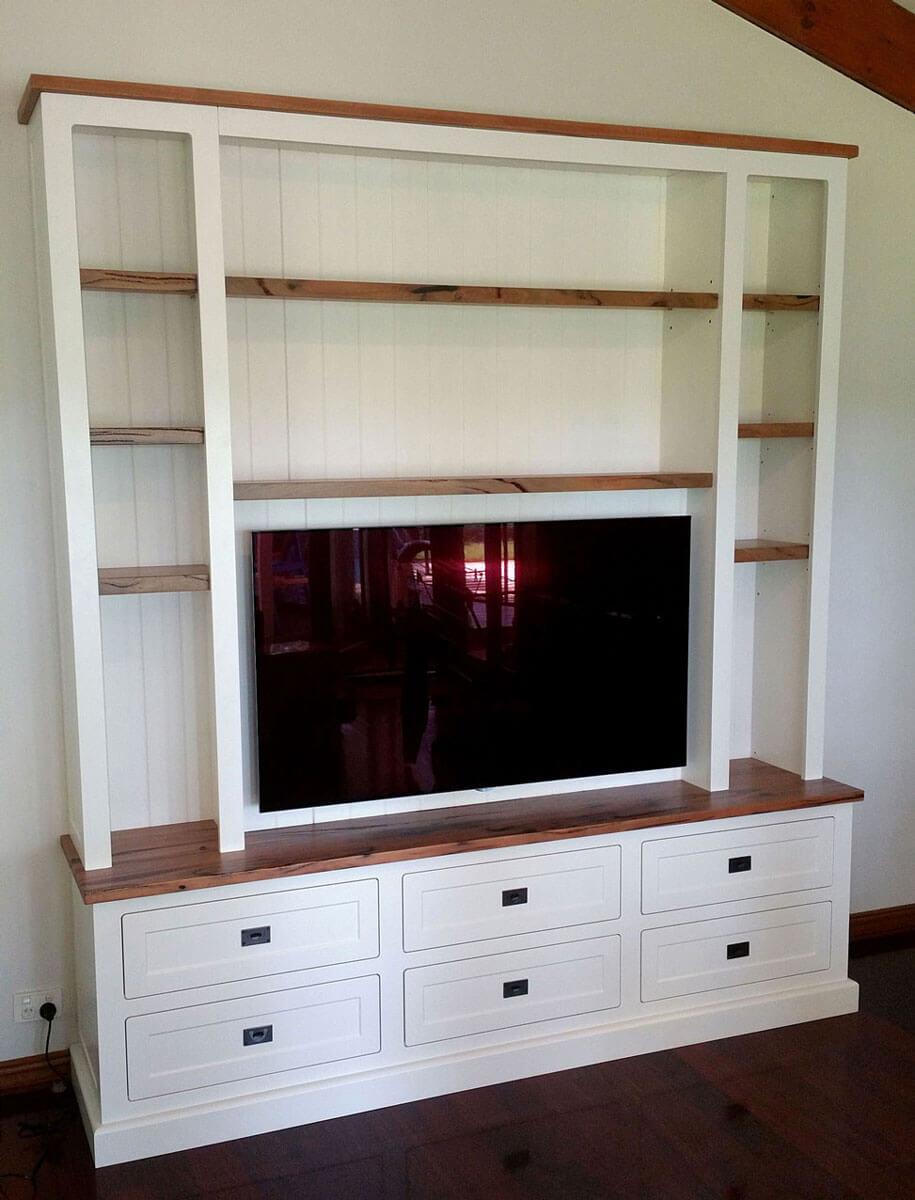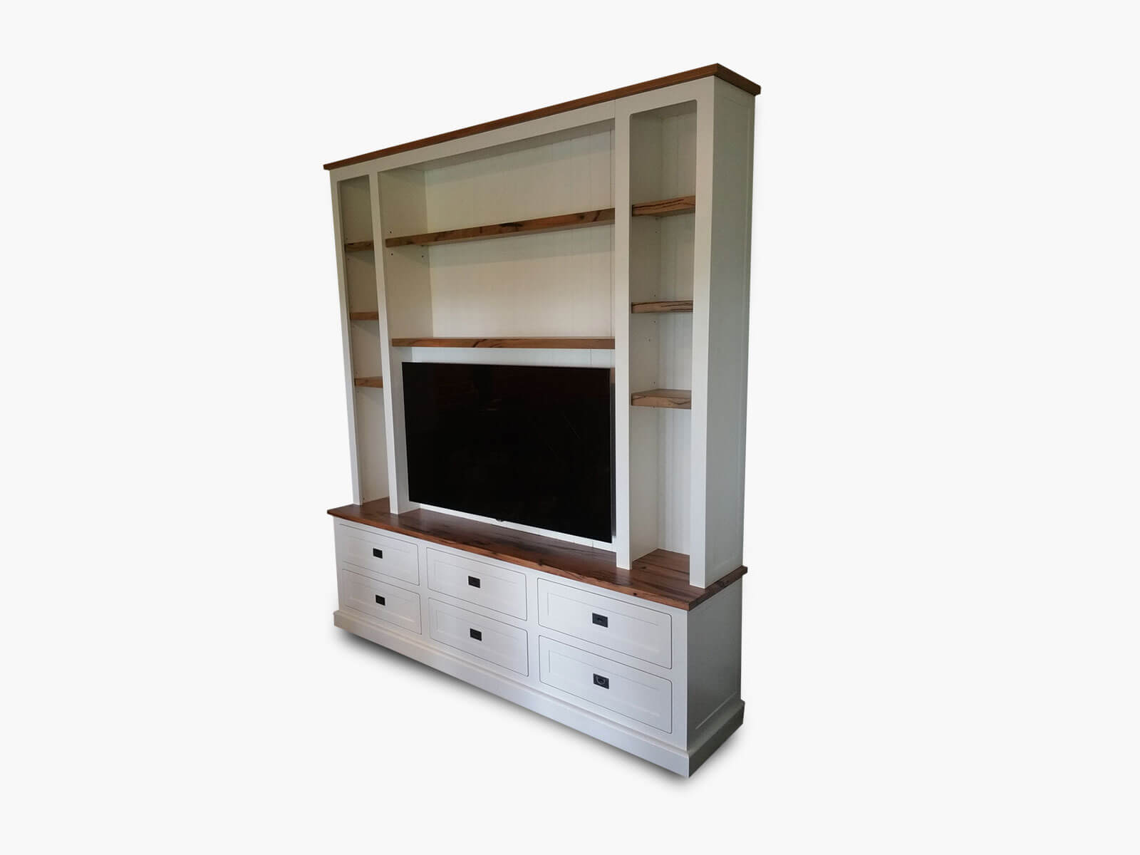 Inspired by the classic Hampton style, the Mundaring has a fresh white finish and is pictured with a Marri top and adjustable shelves. The unit includes 6 draws and false cavity panel to conceal cords. Can be customised in wide range of timbers and colour finishes. Enquire to discuss your needs.